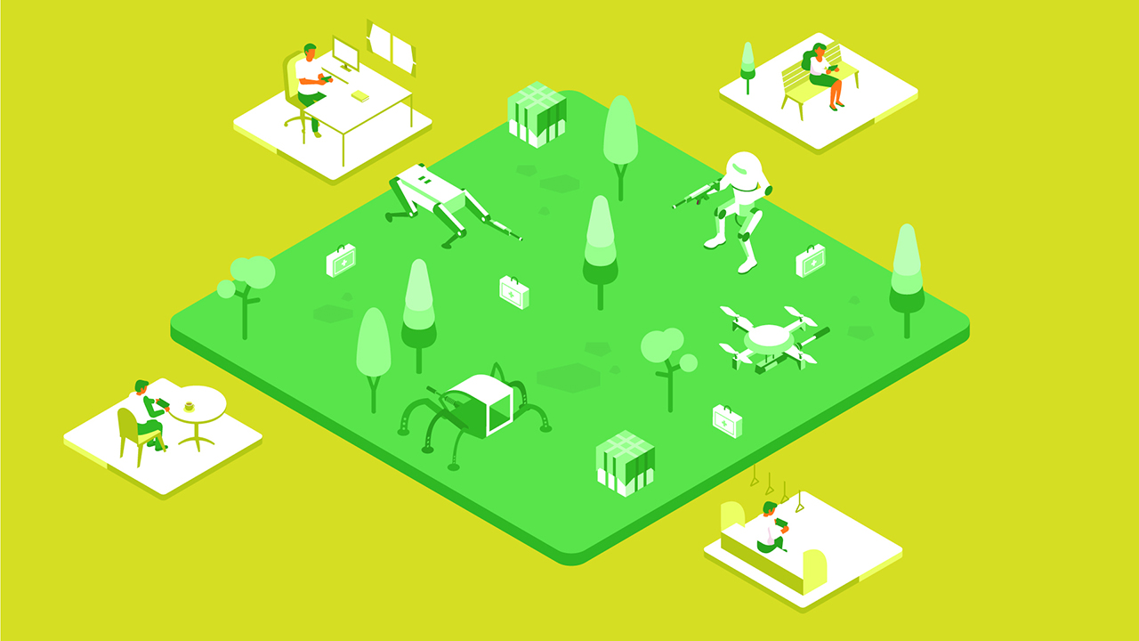 ロボットを遠隔操作するゲームや競技が普及。ロボットを交えることで、ゲームの中のような人間の能力を超えた機能やアクションを現実でもできるようになり、既存の遊びを拡張したり、まったく新しい競技がうまれるかもしれません。例えば、ドローンや四足歩行ロボットなどを交えたサバイバルゲームは、きっと白熱した体験になるはずです。また、フットサルやバスケなどのスポーツでも、都合が合わなくてコートに行けない人は、代わりにロボットを遠隔操作して参加なんてことも。
