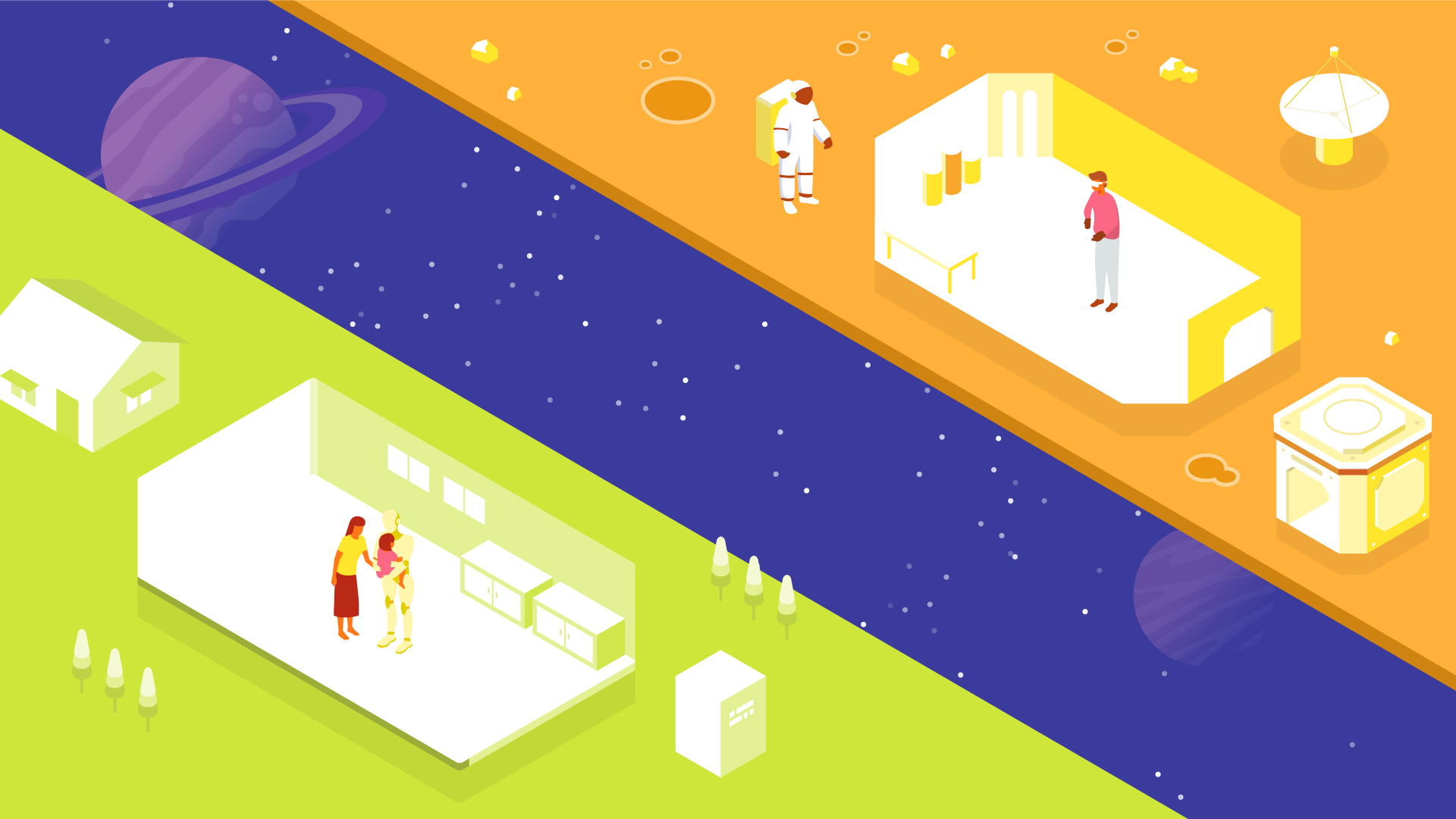 星をまたいで大切な人とふれあいを。惑星開拓が進み、地球外に出張や単身赴任することもある未来では、通信システムも6G、もしくはさらにその先になっており、ハプティクス(触覚)技術やテレプレゼンス技術も発達しているはずです。はるか遠くにいる大切な人のぬくもりや肌触りもアバターロボットを通じて、リアルタイムに伝送・再現ができるようになっているかもしれません。家族や恋人と触れ合うだけでなく、家事や育児・介護を手伝ったり、一緒に遊びや運動なんてことも。