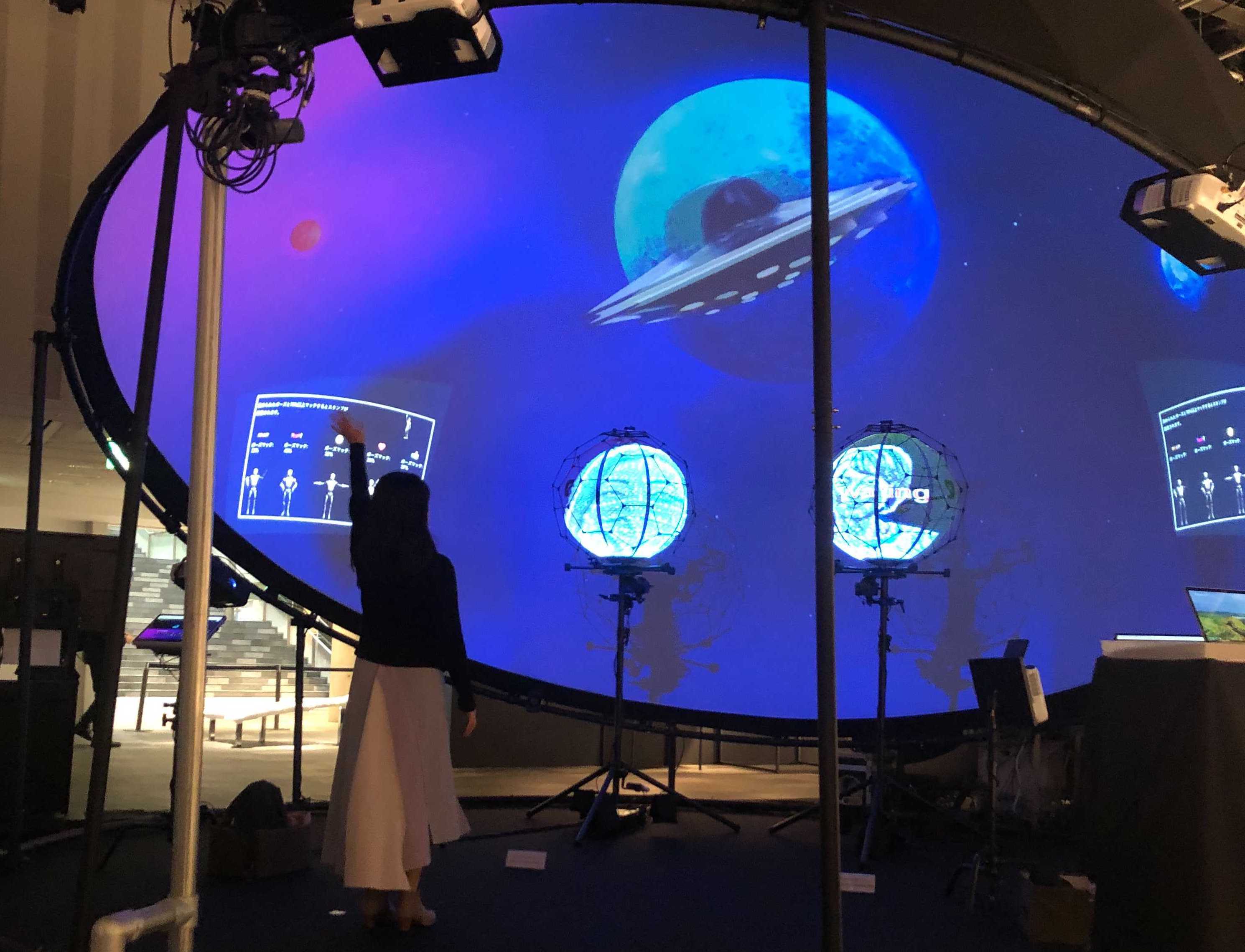 2台の浮遊球体ドローンディスプレイにユーザーの顔が映し出され、ドームスクリーンに投影されるスタンプやモーショングラフィックを交換し合うノンバーバルなコミュニケーションを軸としつつ、WebRTCやライブストリーミングの技術を取り入れ、参加者同士の距離を超えたコミュニケーションを目指しました。