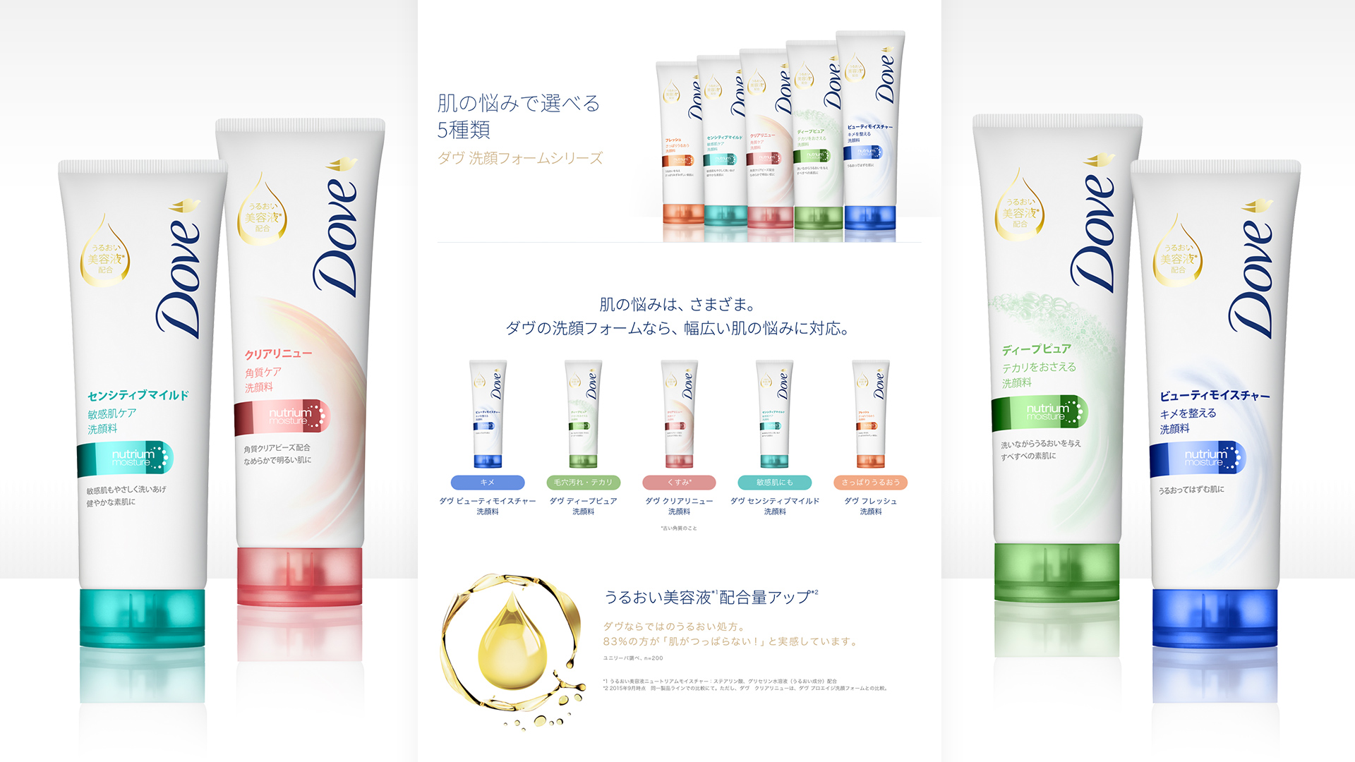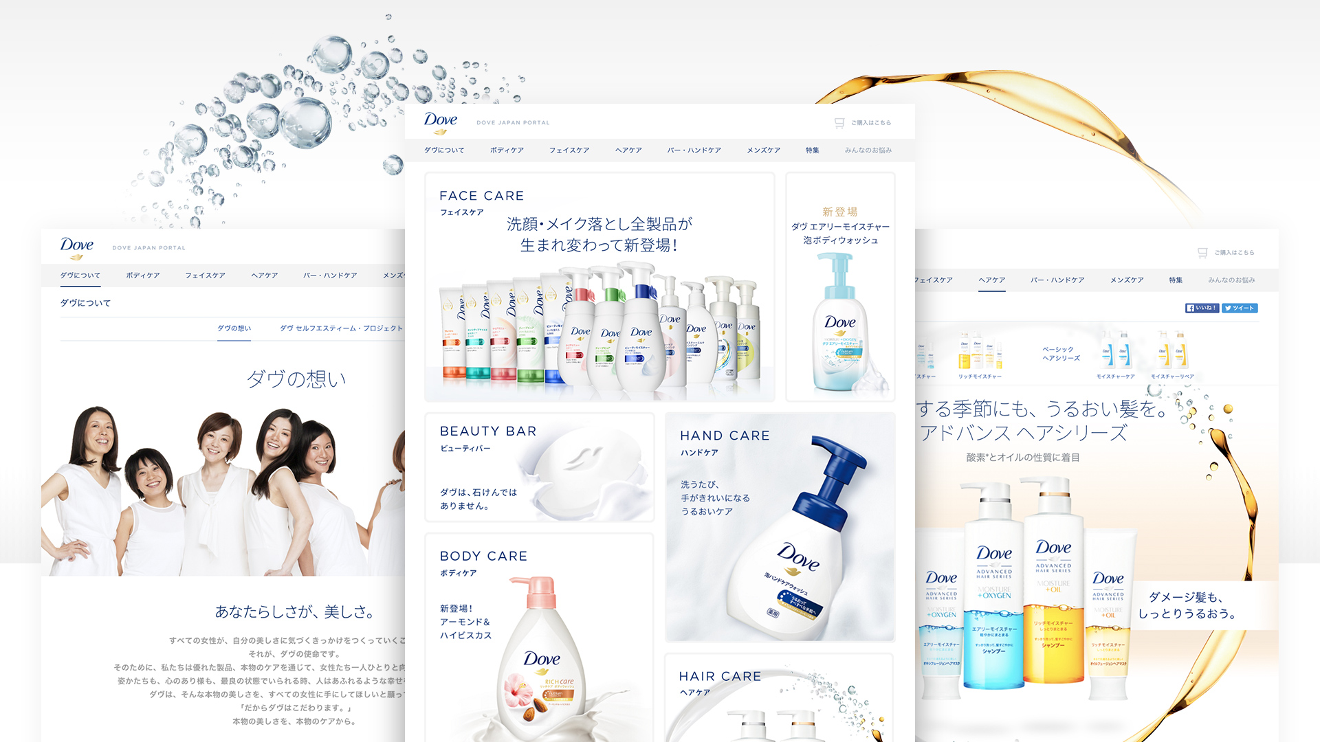 Unilever Dove Japan Portal Web ダヴは世界35カ国以上で販売されているグローバルブランドで、日本でも幅広い製品群を展開。イメージソースは2015年から国内のデジタルエージェンシーとしてブランドのデジタルアクティビティをサポートしています。 従来、オフィシャルのグローバルサイトとは別に独自のキャンペーンサイトや製品カテゴリー別のマイクロサイトなどが多数存在していましたが、それらを共通のブランドイメージで管理するポータルサイトを構築。また、関連のバナー広告などのクリエイティブイメージも統一し、オンラインでのブランドイメージの統一と向上に努めています。 Date 2016.03.01 Share Facebook Twitter
